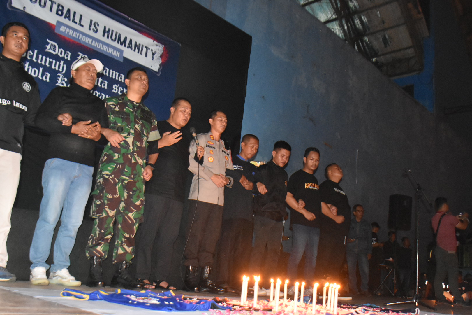 KARANGANYAR – Ribuan masyarakat pecinta sepak bola di bumi Intanpari sesaki GOR RM SAID dalam acara doa bersama bagi korban tragedi di Stadion Kanjuruhan Malang Jawa Timur(3/10/22). Supporter bola yang terdiri dari berbagai pendukung klub bola ini kompak mengenakan pakaian hitam guna menghormati para korban yang meninggal dalam insiden treagis di Kanjuruhan tersebut.