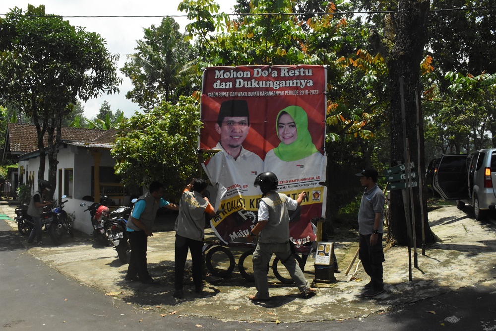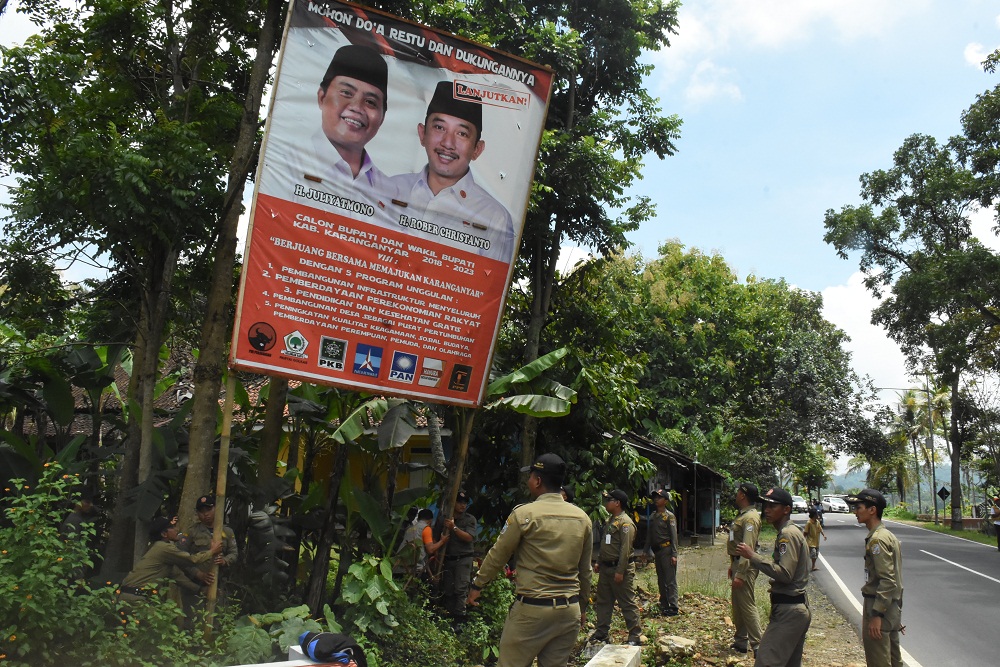 Tim Gabungan yang terdiri dari Dinas Perhubungan Perumahan dan Kawasan Permukiman (Dishub PKP), Satpol PP, Panwaslu, dan KPU Karanganyar melakukan penertiban Alat Peraga Kampanye (APK) dan Alat Peraga Sosialisasi (APS) Pemilihan Kepala Daerah Tahun 2018.