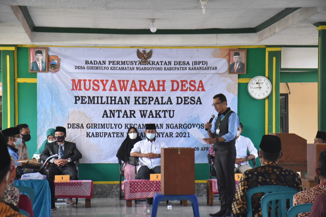 Tiga desa di Kabupaten Karanganyar setidaknya penyelenggarkan pilkades antarwaktu di Bulan April ini. Yakni Desa Girimulyo yang berlangsung hari ini (08/04), Desa Kebak, Kecamatan Jumantono diselenggarakan tanggal 12 April 2021 dan Desa Tlobo, Kecamatan Jatiyoso tanggal 20 April 2021. Untuk Desa Kebak dan Tlobo karena Kepala Desa meninggal, sedangkan satu Desa Girimulyo sedang menajalani masa hukuman.