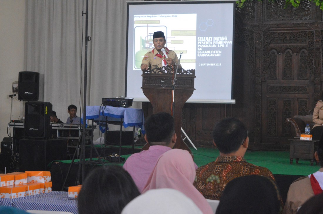 Dalam rangka menjaga pasokan elpiji 3 kg di pasaran, Pemkab Karanganyar mengumpulkan seluruh agen dan pangkalan se Kab. Karanganyar pada kegiatan Pembinaan Pangkalan 3 kg, Rabu (7/9/2016) di Gedung Wanita Karanganyar yang diikuti 1594 pangkalan dan dihadiri Kepala Region IV Jawa Tengah dan DIY.