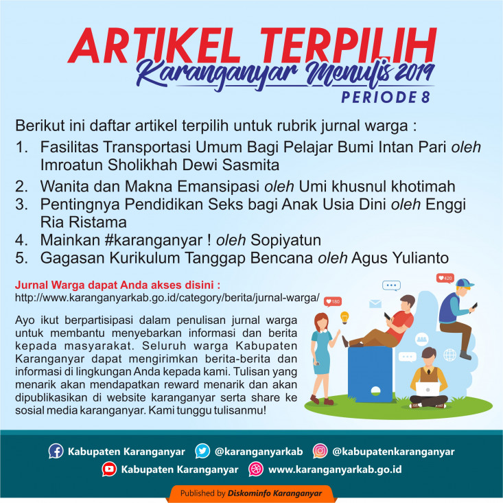 Ayo ikut berpartisipasi dalam penulisan jurnal warga untuk membantu menyebarkan informasi dan berita kepada masyarakat. Seluruh warga Kabupaten Karanganyar dapat mengirimkan berita-berita dan informasi di lingkungan Anda kepada kami. Tulisan yang menarik akan mendapatkan reward menarik dan akan dipublikasikan di website karanganyar serta share ke sosial media karanganyar. Kami tunggu tulisanmu!