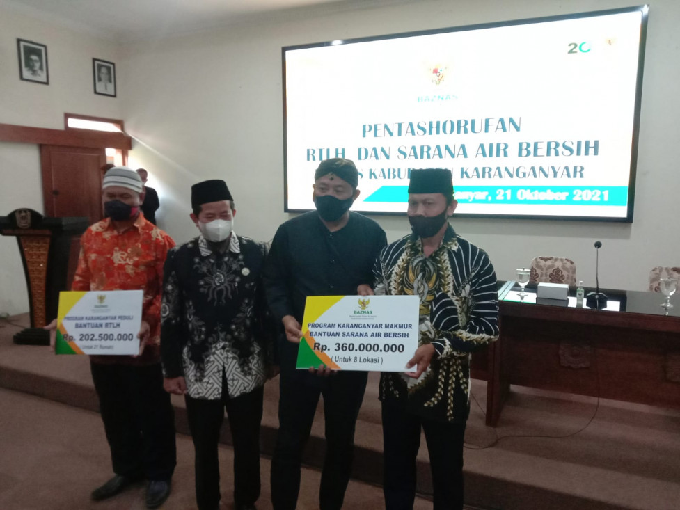 “Semoga bantuan ini dapat memberikan manfaat untuk masyarakat yang membutuhkan. Dari Rencana kerja Baznas Karanganyar program pentashorufan sebesar Rp 15.000.820.000 dan sudah tersalurkan sebesar Rp 15.000.350.000 atau 97 persen,” papar Ketua Baznas Karanganyar H. Khafindi M.Ag pada saat memberikan sambutan dalam pemberian bantuan kepada RTLH dan Sumur Artesis di Anthurium Rumah Dinas Bupati Karanganyar, (21/10).
