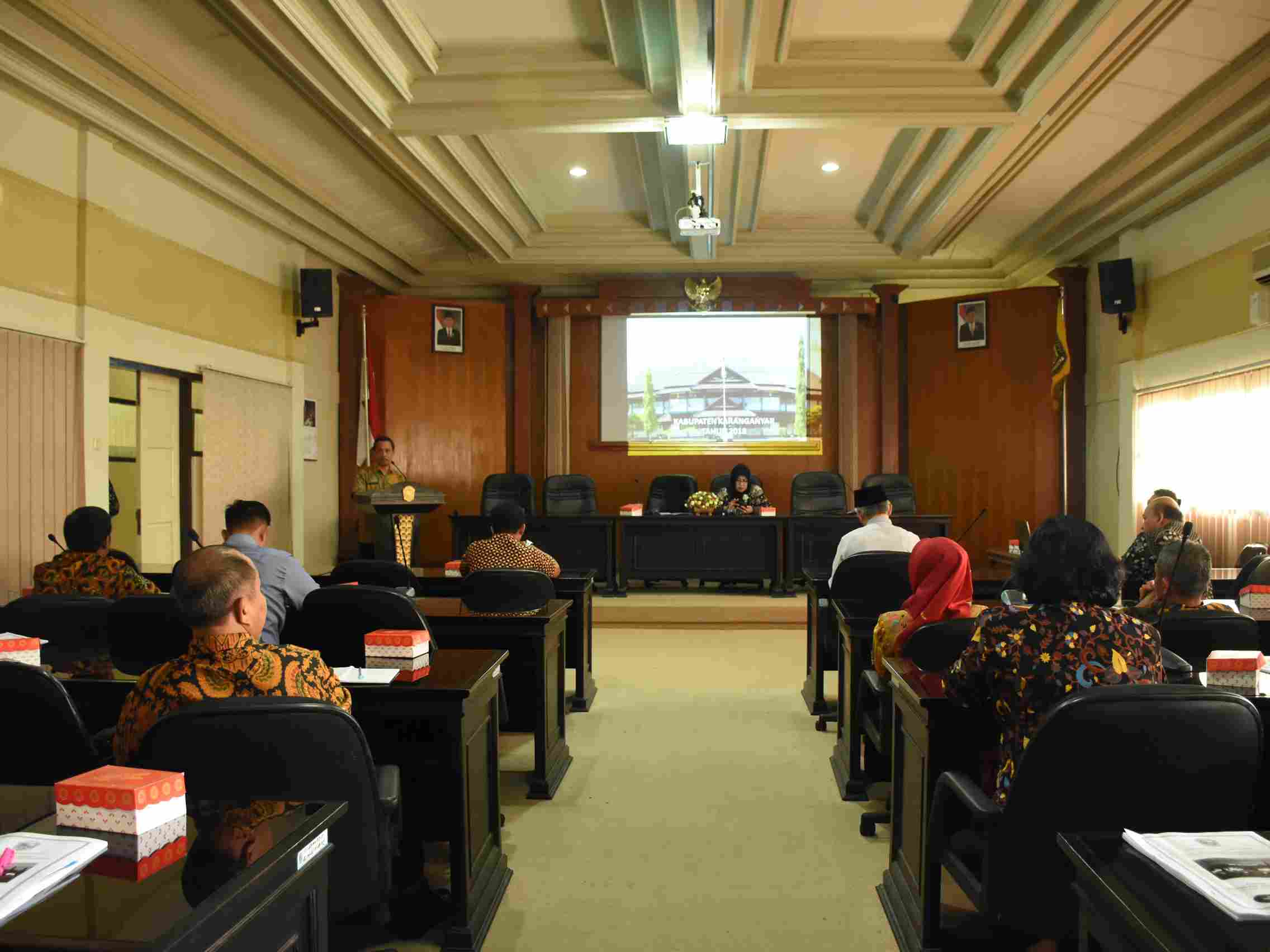 Asisten III Administrasi, Drs Sutarno MSi menyampaikan sambutan Bupati Karanganyar sekaligus membuka secara langsung Sosialisasi Petunjuk Teknis Keprotokolan di Podang I Setda Karanganyar, Selasa (26/6).