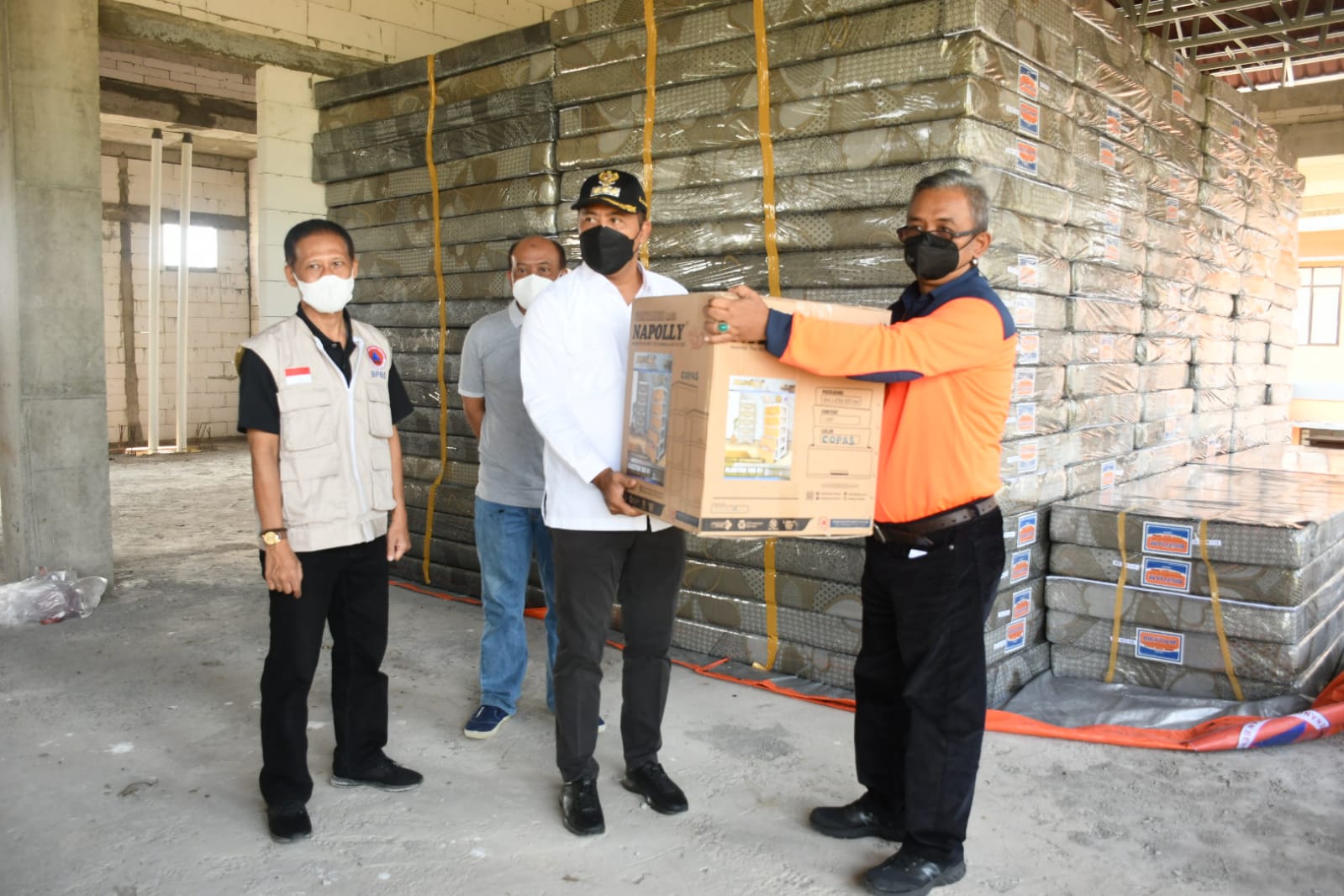 KARANGANYAR- Permintaan Bupati Karanganyar terkait pemenuhan kebutuhan peralatan pasien Covid-19 di Isolasi Terpusat (Isoter) langsung direspon cepat oleh Badan Nasional Penanggulangan Bencana (BNPB). BNPB memberikan bantuan peralatan tersebut di kantor BPBD Kabupaten Karanganyar dan diterima langsung oleh Bupati Karanganyar, Sabtu (21/8). Peralatan-peralatan tersebut terdiri dari kasur 500 buah, lemari kecil 500 buah, bantal 500 buah, velbed 500 buah, sarung bantal 1000 buah, sprei 1000 buah, selimut 500 buah, jemuran handuk 500 buah, tempat sampah 100 buah, dan tabung oksigen 50 buah.