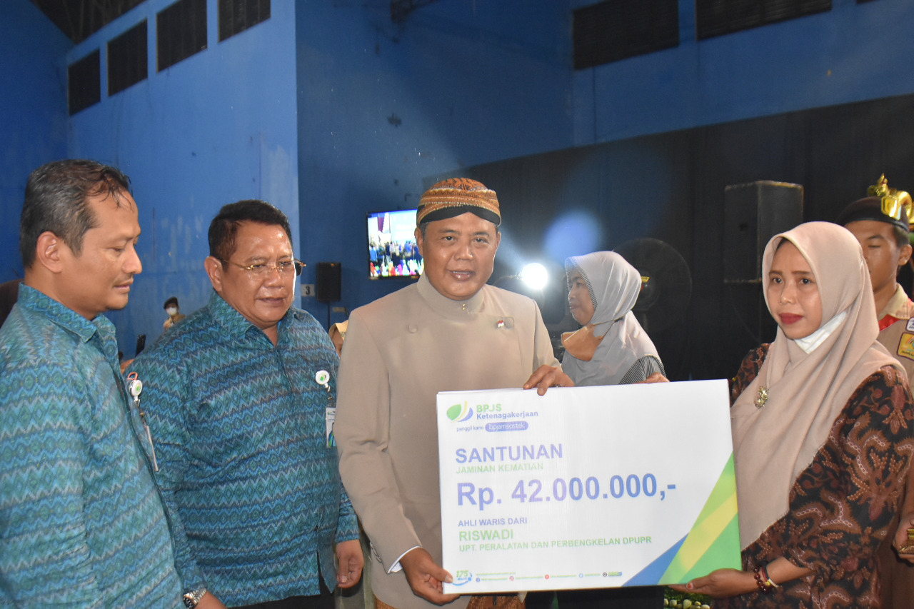 Karanganyar – BPJS Ketenagakerjaan Karanganyar menyampaikan santunan secara simbolis kepada ahli waris peserta BPJS Ketenagakerjaan di Malam Tirakatan Hari Ulang Tahun Kabupaten Karanganyar ke 105, Kamis (17/11) malam di GOR RM Said, Kabupaten Karanganyar. Penyerahan secara simbolis disampaikan secara langsung oleh Bupati Karanganyar, Drs. H. Juliyatmono, M.M, dan Wakil Bupati Karanganyar, H. Rober Christanto, S.E, M.M. Bantuan disampaikan kepada ahli waris dari Riswadi, THL UPT Peralatan dan Perbengkelan DPUPR dengan jenis santunan berupa JKM senilai RP.42.000.000,00 dan beasiswa RP.54.000.000,00. Selanjutnya, santunan diberikan kepada ahli waris dari Suwanto yang merupakan perangkat Desa Surah, Kecamatan Tasikmadu dengan jenis santunan JKM senilai RP.42.000.000,00, beasiswa senilai RP. 64.000.000,00 dan JHT senilai RP. 7.256.586,00. Dan santunan juga diberikan kepada ahli waris dari Anna Rosyiah Handayani yang merupakan guru honorer di SMPN 1 Jatipuro. Adapun jenis santunan yang diberikan adalah JKK senilai Rp. 121.087.080 dan beasiswa sebesar Rp. 124.000.000,00.