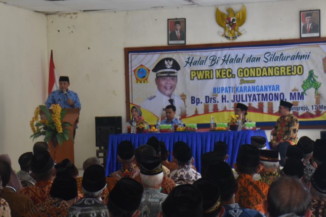 Karanganyar – Bupati Karanganyar, Drs. H. Juliyatmono, MM didampingi jajaran forkopimca Gondangrejo menghadiri halal bihalal PWRI Kecamatan Gondangrejo di Aula Kecamatan Gondangrejo, Selasa (17/05).