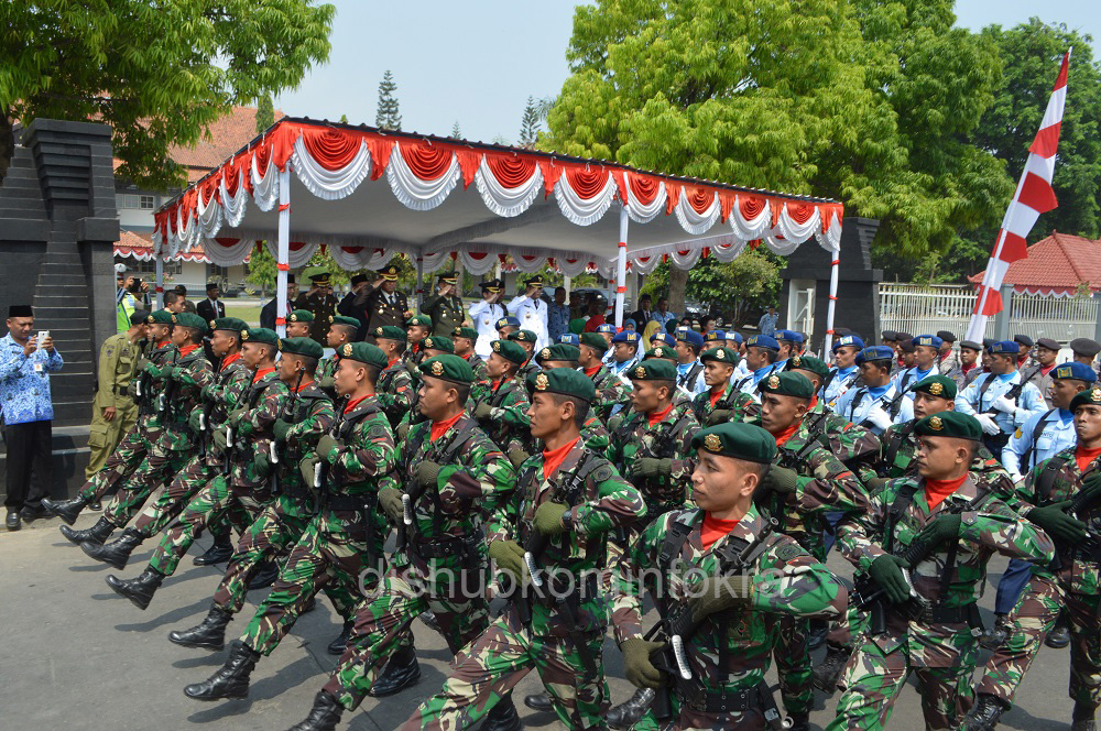 Setelah upacara usai, para peserta berdefile dihadapan para tamu undangan didepan Setda Kabupaten Karanganyar, dengan diiringi korsik gabungan Polres Karanganyar dan Ssatpol PP.pd