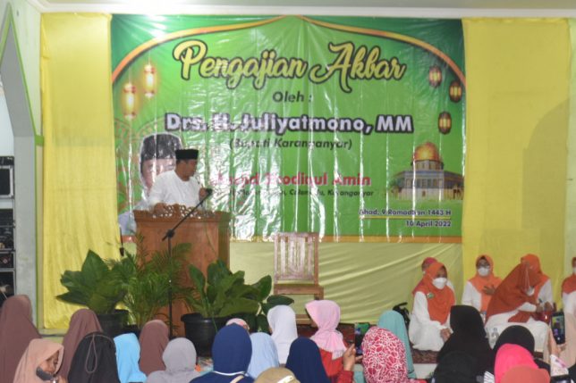 Bupati Karanganyar saat memberikan tausyah di Masjid Shodikul Amin, Pulosari, Desa Malangjiwan, Kecamatan ColomaduSebelum mendengarkan tausiyah oleh Bupati Karanganyar, rombongan Pemkab Karanganyar dihibur dengan pergelaran seni hadroh oleh ibu-ibu jama’ah Masjid Shodikul Amin.