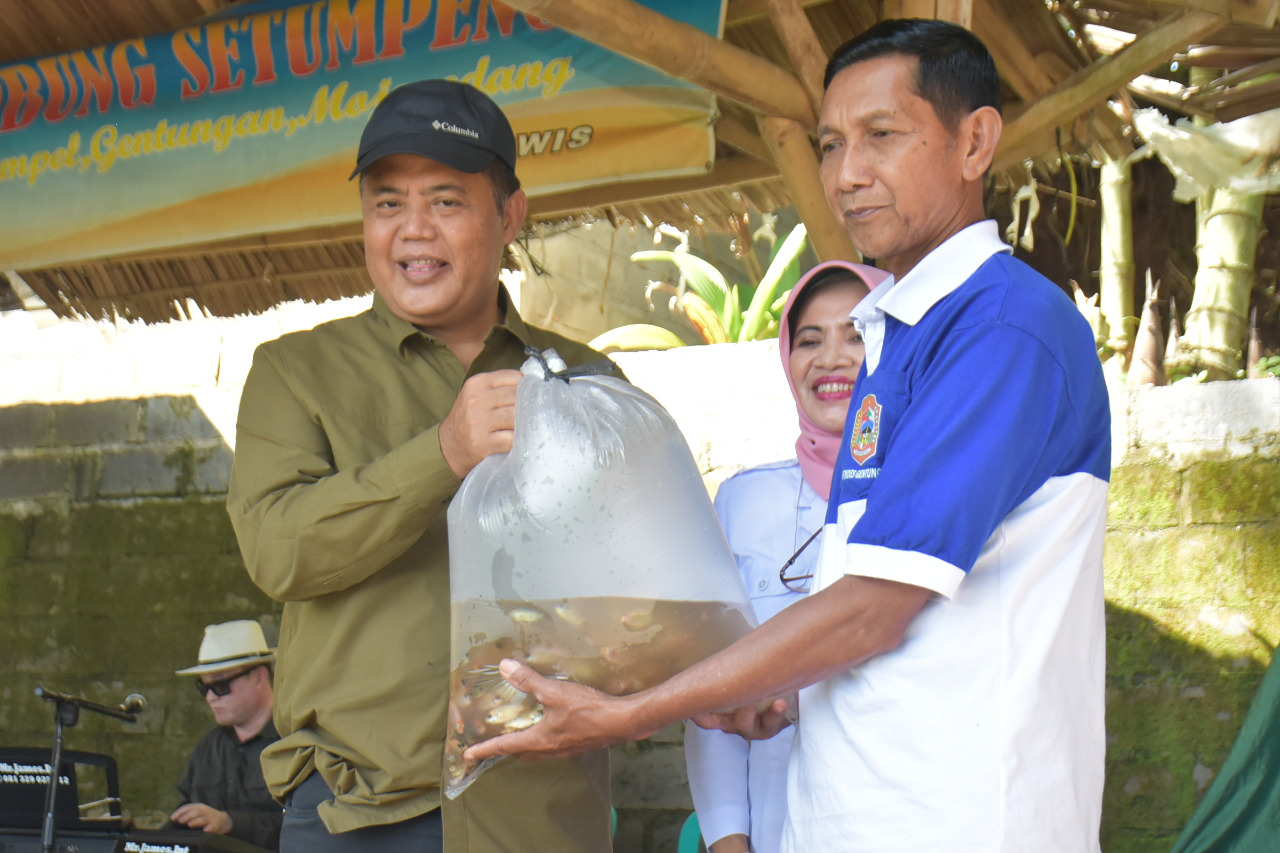KARANGANYAR – Sebanyak 3.000 benih ikan nila disebar di Embung Setumpeng Desa Gentungan Kecamatan Mojogedang Kabupaten Karanganyar, Jumat (13/1/2023).