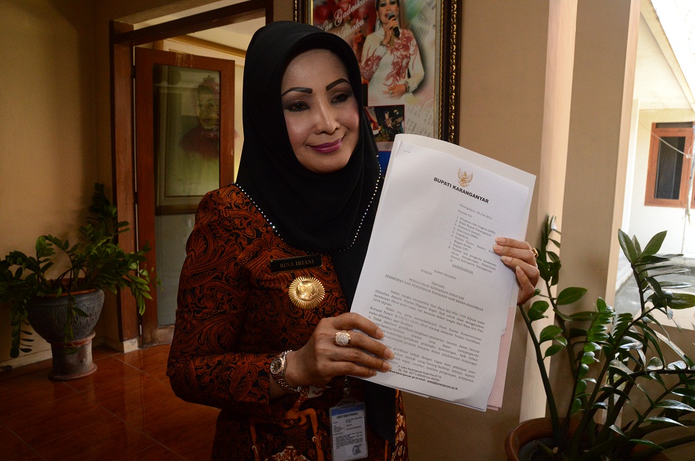 Bupati Karanganyar, Rina Iriani secara tegas melarang penggunaan mobil dinas pejabat  di lingkungan Pemerintah Kabupaten Karanganyar untuk mudik Lebaran Tahun 2013. Hal itu tertuang dalam Surat Edaran yang ditanda tangani oleh Bupati Karanganyar.