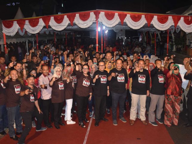 Bupati dan Wakil Bupati Karanganyar beserta rombongan Forkopimda saat momentum ” Sruput Bareng Kopi Karanganyar Lawu ” bersama Ikatan Alumni FIB UNDIP dalam acara Coffe Culture Fest di Pelataran Alun-alun Karanganyar