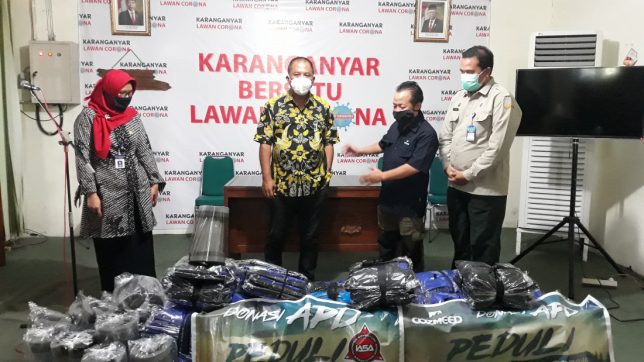Bantuan yang dikhususkan bagi BPBD dan DKK Karanganyar tersebut diterima langsung oleh Bupati Karanganyar, Juliyatmono di Posko Gugus Tugas Penanganan Covid-19 Rumah Dinas Bupati Karanganyar.