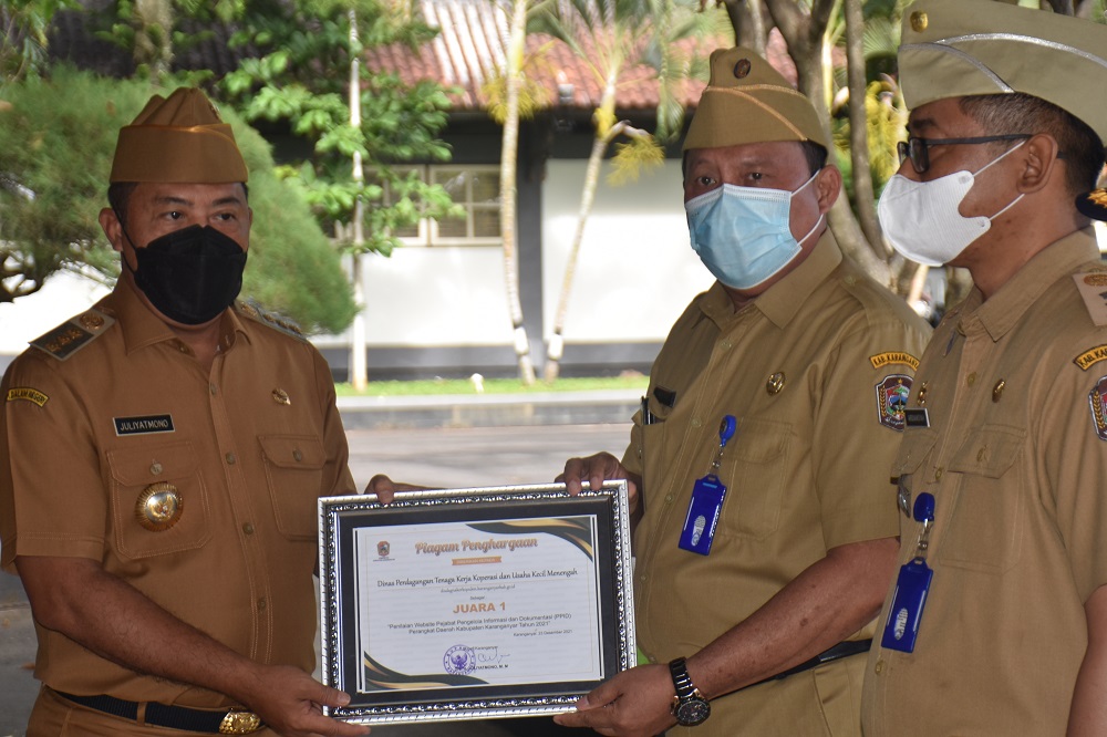 Bupati Karanganyar, Drs. H. Juliyatmono, MM, menyerahkan hadiah kepada Kepala Dinas Perdagangan Ketenaga Kerjaan Koperasi dan UKM, Drs. Martadi, sebagai juara 1 Lomba Pengelolaan Informasi Publik Melalui Website Perangkat Daerah tahun 2021 di Kantor Bupati Karanganyar, Senin (27/12)