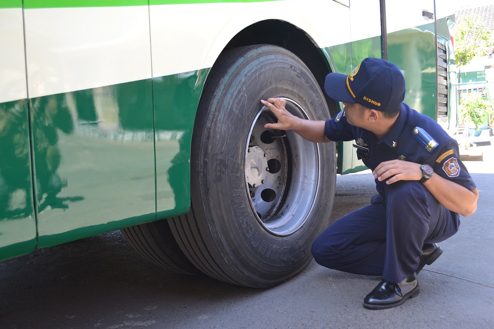 Sebanyak 12 bus Antar Kota Antar Provinsi (AKAP) dan Antar Kota Dalam Provinsi (AKDP). Petugas dari Dishubkominfo Karanganyar memeriksa kondisi bus angkutan balik Lebaran antara lain rem, sein, ban, wiper, pemecah kaca, dan kelengkapan administrasi.