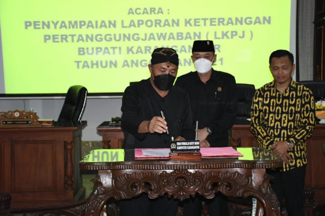 Drs. Juliyatmono, M. M dalam laporannya juga menyampaikan bahwa tahun 2021 Kabupaten Karanganyar meraih sejumlah 13 prestasi Tingkat Nasional dan 8 Inovasi Aplikasi. Acara tersebut diakhiri dengan Penyerahan Laporan LKPJ Tahun Anggaran 2021 oleh Bupati kepada Ketua DPRD Karanganyar kemudian dilanjut Penandatanganan berita acara oleh Bupati, kemudian Ketua DPRD Karanganyar.