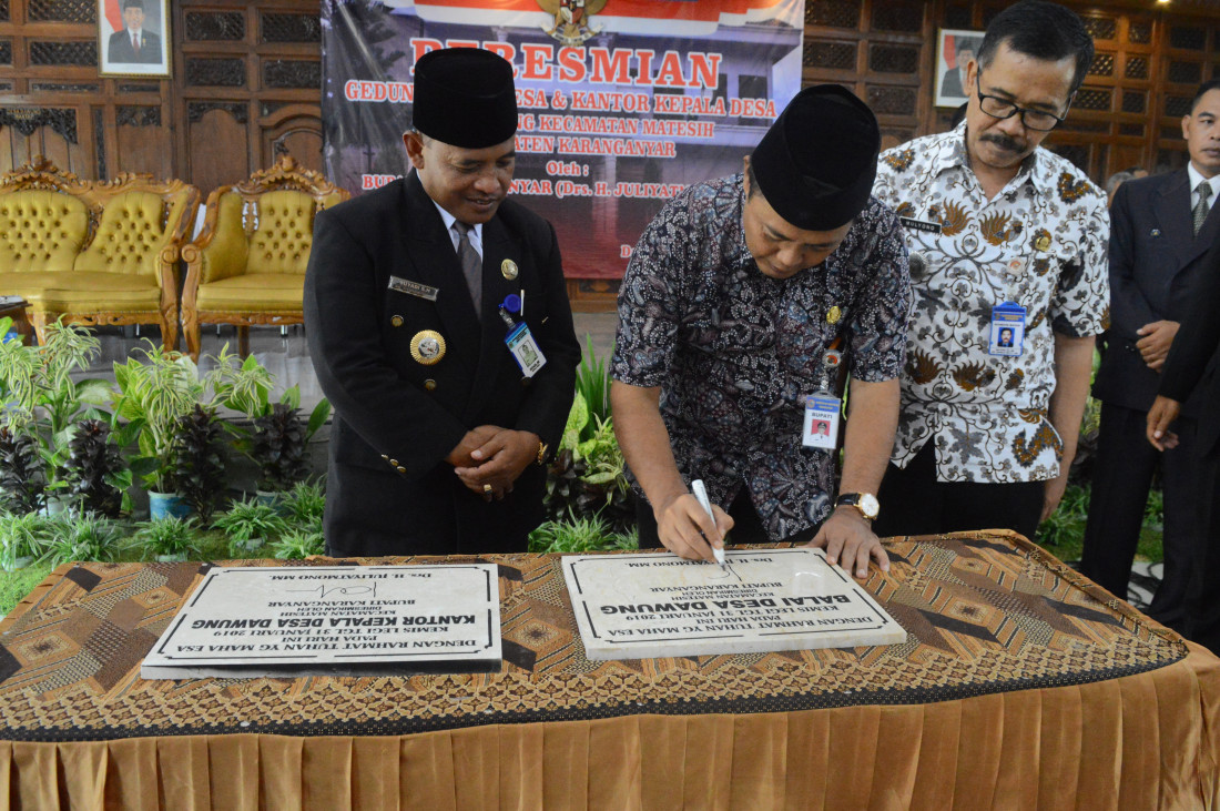 Simbolis : Bupati Karanganyar menandatangani prasasti peresmian Gedung Balai Desa dan Kantor Kepala Desa, Desa Dawung Kecamatan Matesih Karanganyar, Kamis (31/01).