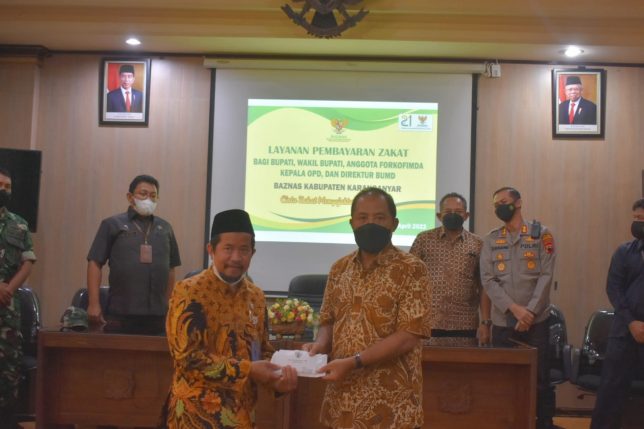 Pemberian Zakat secara simbolis oleh Bupati Karanganyar Drs. H. Juliyatmono.M,M. Kepada Badan Amil Zakat Nasional Kabupaten Karanganyar, Selasa (12/4).