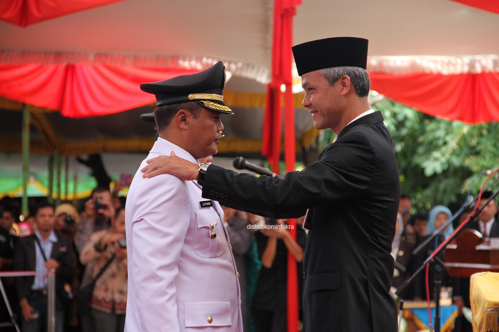 Gubernur Jawa Tengah Ganjar Pranowo melantik dan mengambil sumpah Bupati Karanganyar Juliyatmono dan Wakil Bupati Rohadi Widodo periode 2013-2018, di Taman Pancasila, Karanganyar, Minggu (15/12).Gubernur Jawa Tengah Ganjar Pranowo menyematkan tanda pangkat Bupati Karanganyar Juliyatmono