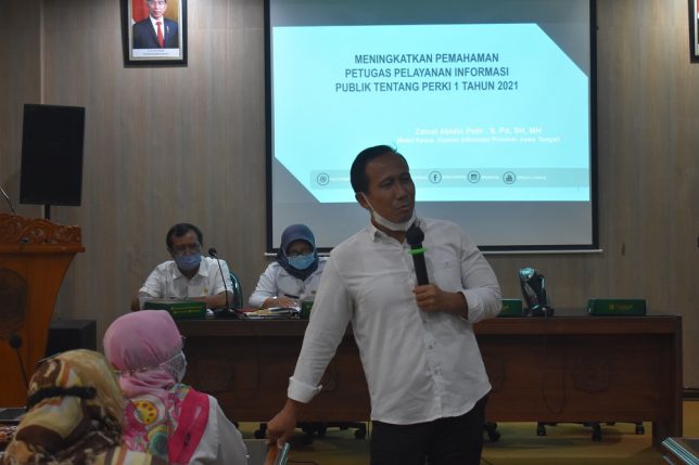 Wakil Ketua Komisi Informasi Provinsi Jawa Tengah, Zainal Abidin Petir, S.Pd, S.H, M.H menyampaikan materi dalam Sosialisasi Perki 1 Tahun 2021 di Ruang Podang 2, Kantor Bupati Karanganyar, Rabu (16/02)