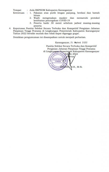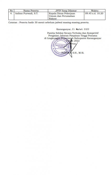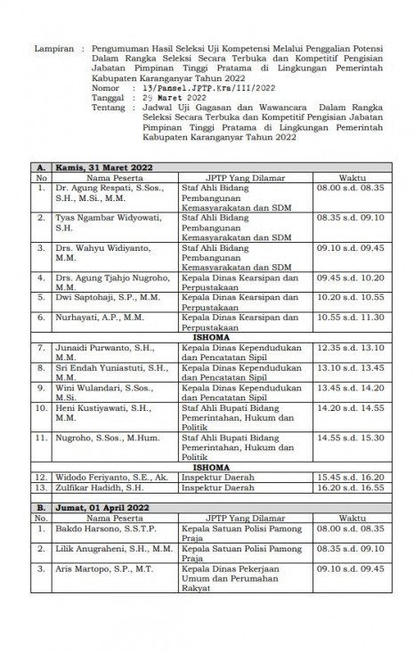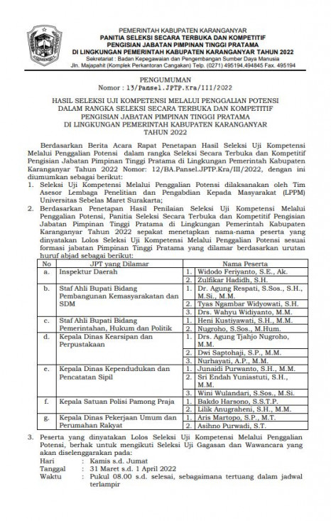 Hasil Seleksi Uji Kompetensi Melalui Penggalian Potensi Dalam Rangka Seleksi Secara Terbuka Dan Kompetitif Pengisian Jabatan Pimpinan Tinggi Pratama Di Lingkungan Pemerintah Kabupaten Karanganyar Tahun 2022