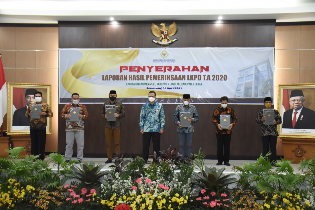 KARANGANYAR – Bupati Karanganyar H. Juliyatmono dan juga Ketua DPRD Karanganyar Bagus Selo didampingi Sekda Karanganyar Sutarno, Kepala Inspektorat dan Kepala Badan Keuangan Daerah Kabupaten Karanganyar hadiri penghargaan LHP LKPD di Kantor BPK Jawa Tengah, Jum’at(30/04/21).
