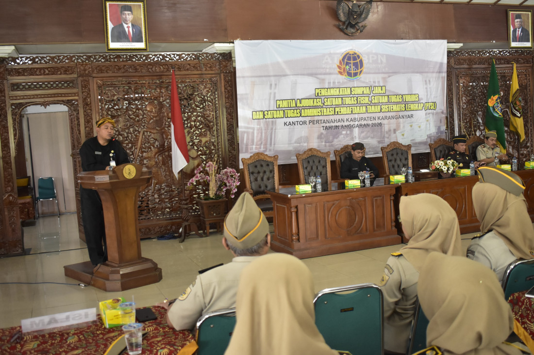Lalu satuan tugas yuridis, dan satuan tugas administrasi PTSL di Pendopo Rumah Dinas Bupati Karanganyar, Kamis (20/2/2020). Anton menyampaikan, Karanganyar mendapatkan alokasi dalam program PTSL sejumlah 12 ribu sertifikat hak atas tanah dan 20 ribu Peta Bidang Tanah (PBT) pada tahun ini.