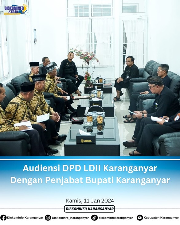 KARANGANYAR– Penjabat (Pj) Bupati Karanganyar Timotius Suryadi didampingi Penjabat Sekretaris Daerah Karanganyar beserta pimpinan OPD sambut dengan hangat Audiensi bersama DPD Lembaga Dakwah Islam Indonesia (LDII) Kabupaten Karanganyar di ruang Anthurium Pendopo RM. Said Rumah Dinas Bupati, Kamis (11/1/2024) siang tadi.