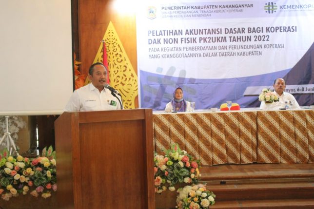 KARANGANYAR- Guna melejitkan potensi pengelolaan keuangan koperasi dan UMKM, Pemerintah Kabupaten Karanganyar mengadakan Pelatihan Akuntansi dasar bagi Koperasi di Hotel Jawa Dwipa. Pelatihan yang dilaksanakan selama tiga hari mulai 6-8 Juni 2022 tersebut diharapkan mampu melejitkan koperasi dan UMKM di Karanganyar. Era media sosial membuat koperasi dan UMKM mau tidak mau menggunakan media sosial agar dikenal public luas.