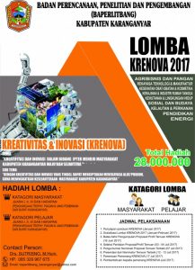 Dalam rangka melaksanakan Misi ke 2 RPJMD Kabupaten Karanganyar Tahun 2014-2018 yaitu Menciptakan 10.000 Wirausaha Mandiri pada Sasaran meningkatnya pengembangan dan pemanfaatan teknologi tepat guna/padat karya, dengan Arah Kebijakan Bupati Karanganyar Pengembangan Produk Unggulan dengan kualitas, harga dan kemasan yang berdaya saing, Badan Perencanaan Penelitian dan Pengembangan (BAPPERLITBANG) Kabupaten Karanganyar akan mengadakan “LOMBA KREATIVITAS DAN INOVASI (KRENOVA) BAGI MASYARAKAT DAN PELAJAR KABUPATEN KARANGANYAR TAHUN 2017”. Sebagai cerminan keikutsertaan masyarakat dalam memajukan teknologi terapan, sekaligus untuk memperoleh solusi yang tepat terhadap permasalahan teknologi yang tengah dihadapi dan dimanfaatkan secara mudah guna menghasilkan nilai tambah dari aspek ekonomi dan aspek lingkungan hidup Menuju Generasi Bangsa yang Kreatif dan Inovatif.