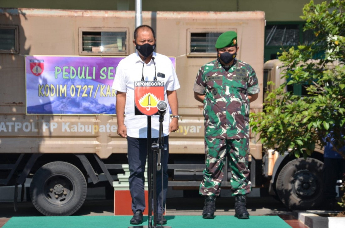 Bupati Karanganyar, Juliyatmono memberikan arahaan pada saat pelepasan bantuan dari Kodim 0727 Karanganyar untuk korban bencana erupsi di Gunung Semeru.