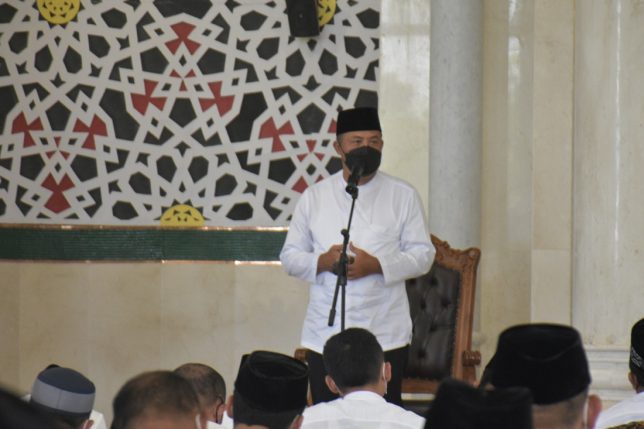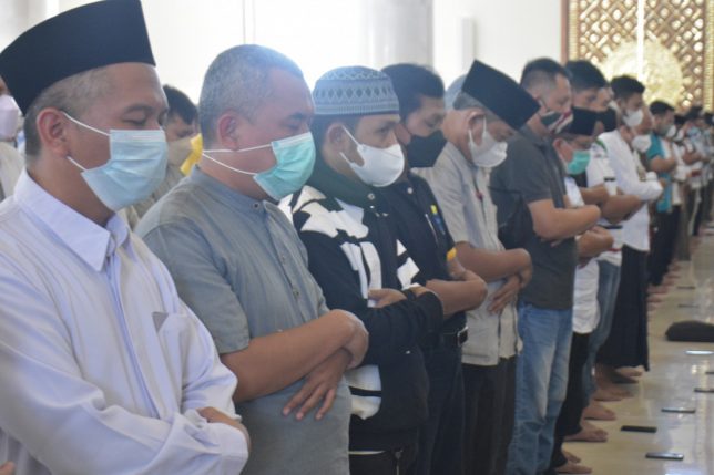 Karanganyar – Bupati Karanganyar, Drs. H. Juliyatmono, MM, melaksanakan ibadah Sholat Jum’at di Masjid Agung Madaniyah, Jum’at (11/03). Sholat Jum’at dihadiri berbagai kalangan masyarakat, mulai dari jajaran pemerintahan hingga masyarakat umum. Sholat Jum’at tetap menerapkan protokol kesehatan yang cukup ketat, salah satunya adalah dengan melakukan cek suhu badan saat melewati pintu masuk masjid.