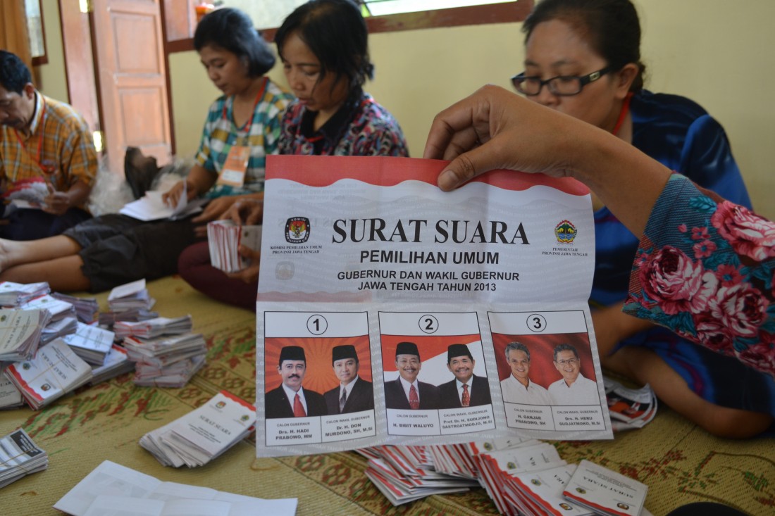 Karanganyar. Sejumlah orang melakukan pelipatan surat suara untuk Pemilihan Gubernur dan Wakil Gubernur Jawa Tengah Tahun 2013, di Aula Kelurahan Cangakan, Karanganyar, Senin (06/05). Kegiatan itu dimulai Minggu (05/05/2013) dan target selesai tiga hari mendatang.
