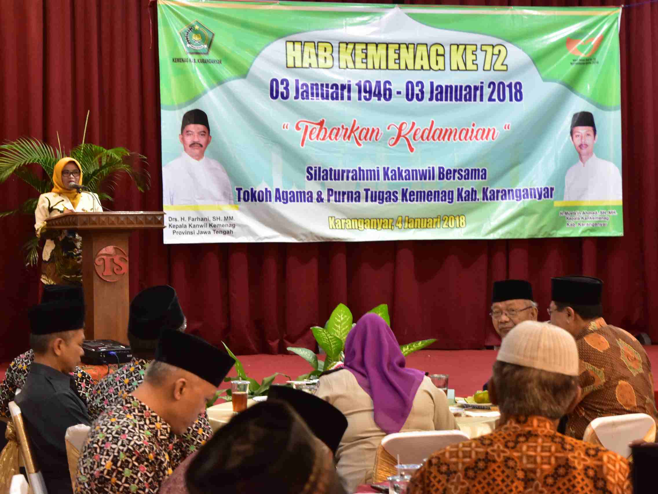 “Kami terus berupaya membangun sinergi dengan Kementrian Agama Karanganyar. Pak Bupati sangat cinta dengan Kemenag Karanganyar. Wujudnya dilakukan berbagai program mendukung program Kemenag,” papar Assisten Perekonomian, Pembangunan dan Kesejahteraan Rakyat, Siti Maisyaroch saat memberikan sambutan mewakili bupati di acara Hari Amal Bakti ke 72 Kemenag Karanganyar di Hotel Taman Sari, Karanganyar, Kamis (4/12).