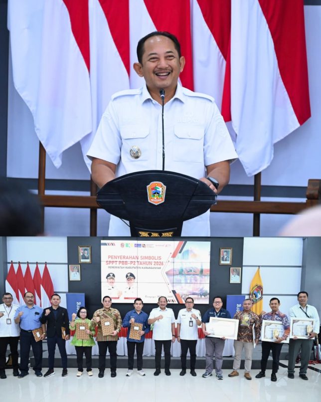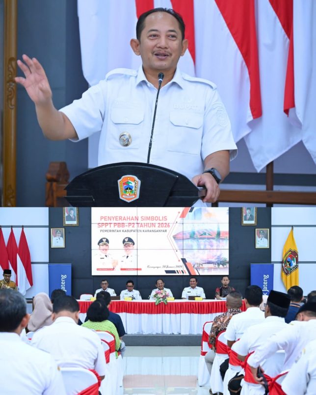 KARANGANYAR — Pemerintah Kabupaten Karanganyar melalui Badan Keuangan Daerah (BKD) melaksanakan penyerahan simbolis Surat Pemberitahuan Pajak Terutang (SPPT) Pajak Bumi dan Bangunan Perdesaan dan Perkotaan (PBB-P2) Tahun 2026 pada Januari 2026.