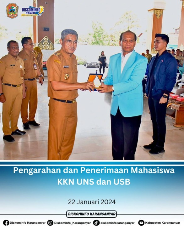 KARANGANYAR– Bertempat di Pendopo Rumah Dinas Bupati Karanganyar Senin (22/01/24), Penjabat (Pj) Bupati Karanganyar kembali menerima mahasiswa dari Universitas Sebelas Maret Surakarta (UNS) dan Universitas Setia Budi Surakarta (USB) yang akan melaksanakan praktek Kuliah Kerja Nyata (KKN) di Kabupaten Karanganyar.