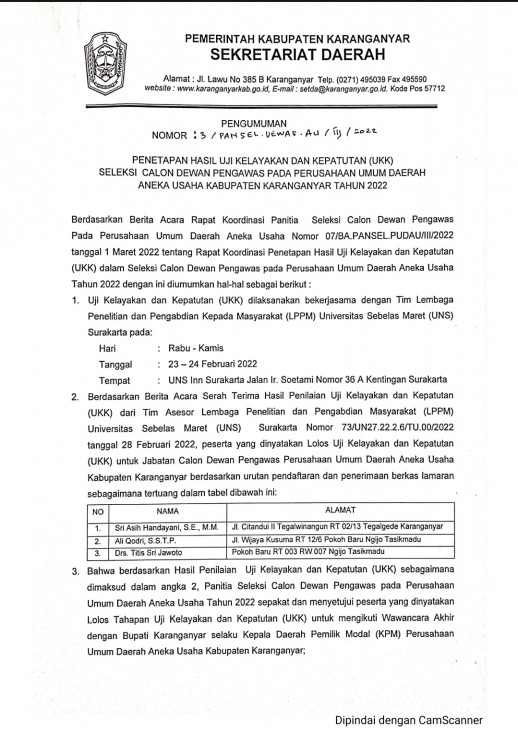Penetapan Hasil Uji Kelayakan Dan Kepatutan (UKK) Seleksi Calon Dewan Pengawas Pada Perusahaan Umum Daerah Aneka Usaha Kabupaten Karanganyar Tahun 2022 timliputan March 5, 2022