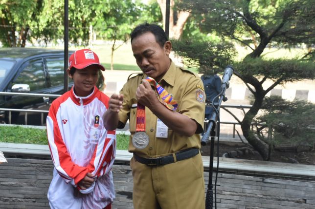Kepala Dinas Pendidikan dan Kebudayaan, Drs Tarsa M.Pd melihat medali perak yang diperoleh Basral dalam ajang skateboard di Sea Games 2019