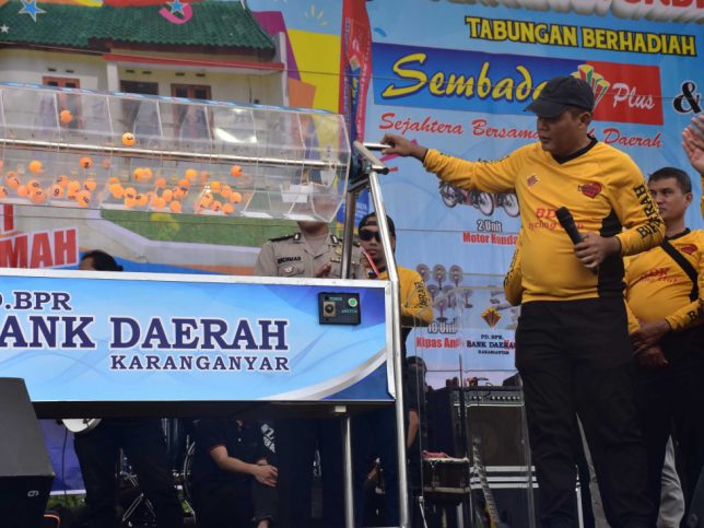 Bupati Karanganyar, Drs. H. Juliyatmono, M.M saat mengundi hadiah utama berupa satu unit rumah dari BPR Bank Daerah Karanganyar dalam rangka HUT Bank Daerah Karanganyar ke 50 di alun-alun Karanganyar