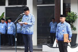 Bupati Karanganyar saat membacakan sambutan Menteri Kesehatan RI pada upacara peringatan HKN ke – 54 di Halaman Kantor DPRD Kabupaten Karanganyar.
