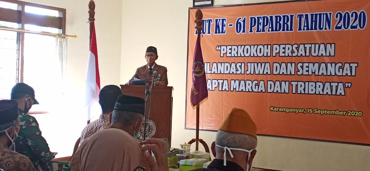 Ketua PEPABRI Kabupaten Karanganyar, Waikun saat membacakan amanat Ketua Umum Pepabri Jendral TNI(Purn) H. Agum Gumelar pada kegiatan HUT PEPABRI ke-61 yang dilaksanakan secara sederhana di Kantor DPC PEPABRI Kabupaten Karanganyar