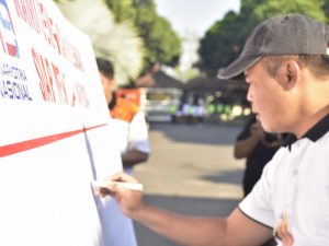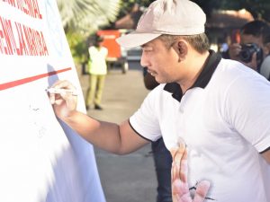 Sebelum melepas para peserta jalan sehat yang diikuti ratusan pelajar SMP/MTs dan SMA/SMK, terlebih dahulu mereka menandatangani papan deklarasi sebagai simbol komitmen pemberantasan peredaran narkoba di Kabupaten Karanganyar.