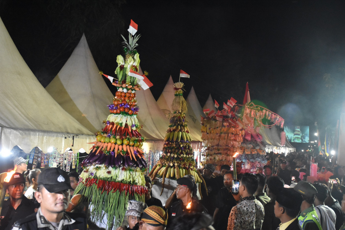 Ratusan warga berebut gunungan berisi hasil bumi, arum manis dan brondong