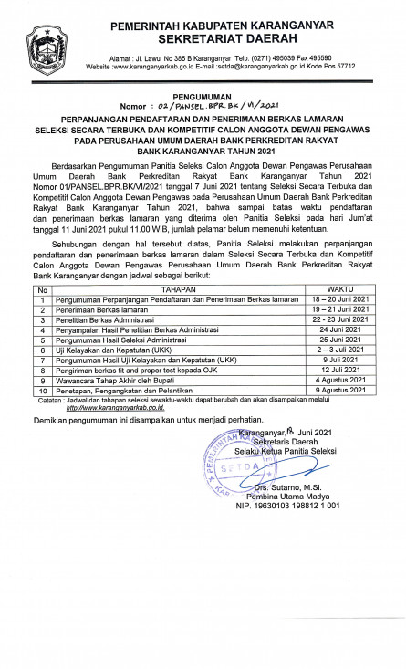 Perpanjangan Pendaftaran dan Penerimaan Berkas Lamaran Seleksi Secara Terbuka dan Kompetitif Calon Anggota Dewan Pengawas Pada Perusahaan Umum Daerah BPR Bank Karanganyar Tahun 2021 admin utama1 June 18, 2021