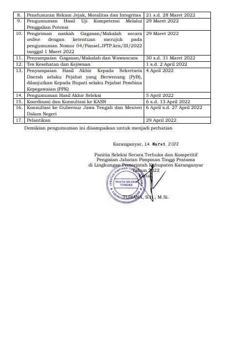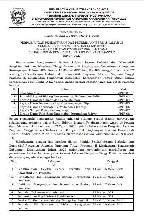Perpanjangan Pendaftaran Dan Penerimaan Berkas Lamaran Seleksi Secara Terbuka Dan Kompetitif Pengisian Jabatan Pimpinan Tinggi Pratama Di Lingkungan Pemerintah Kabupaten Karanganyar Tahun 2022