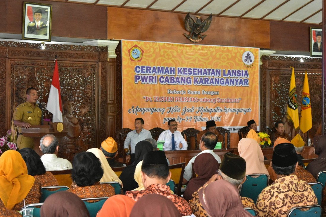 Bekerjasama dengan PWRI Kabupaten Karanganyar, PT. Taspen (Persero) Kantor Cabang Surakarta adakan kegiatan Ceramah Kesehatan yang diikuti oleh 22 ranting PWRI Karanganyar, di Pendopo Rumah Dinas Bupati Karanganyar, Selasa Pagi (15/11). Acara tersebut juga dilaksanakan di seluruh wilayah Solo Raya dan Karanganyar merupakan acara yang paling meriah dikarenakan bertepatan dengan peringatan Hari Jadi Karanganyar Ke-99 yang jatuh pada tanggal 18 November.