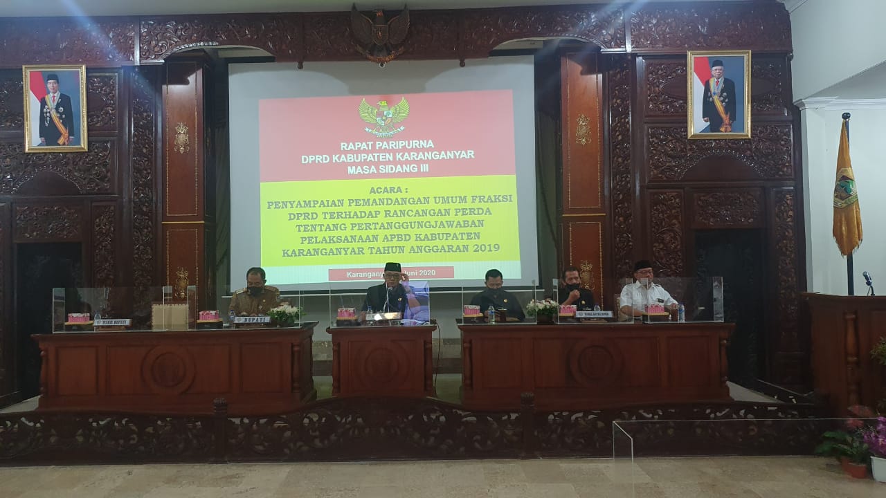 Rapat Paripurna Dewan Pimpinan Rakyat Daerah Kabupaten Karanganyar dengan agenda masa sidang III Penyampaian Pandangan Umum Fraksi DPRD Terhadap Rancangan Perda Tentang Pertanggung Jawaban Pelaksanaan APBD Kabupaten Karanganyar Tahun Anggaran 2019