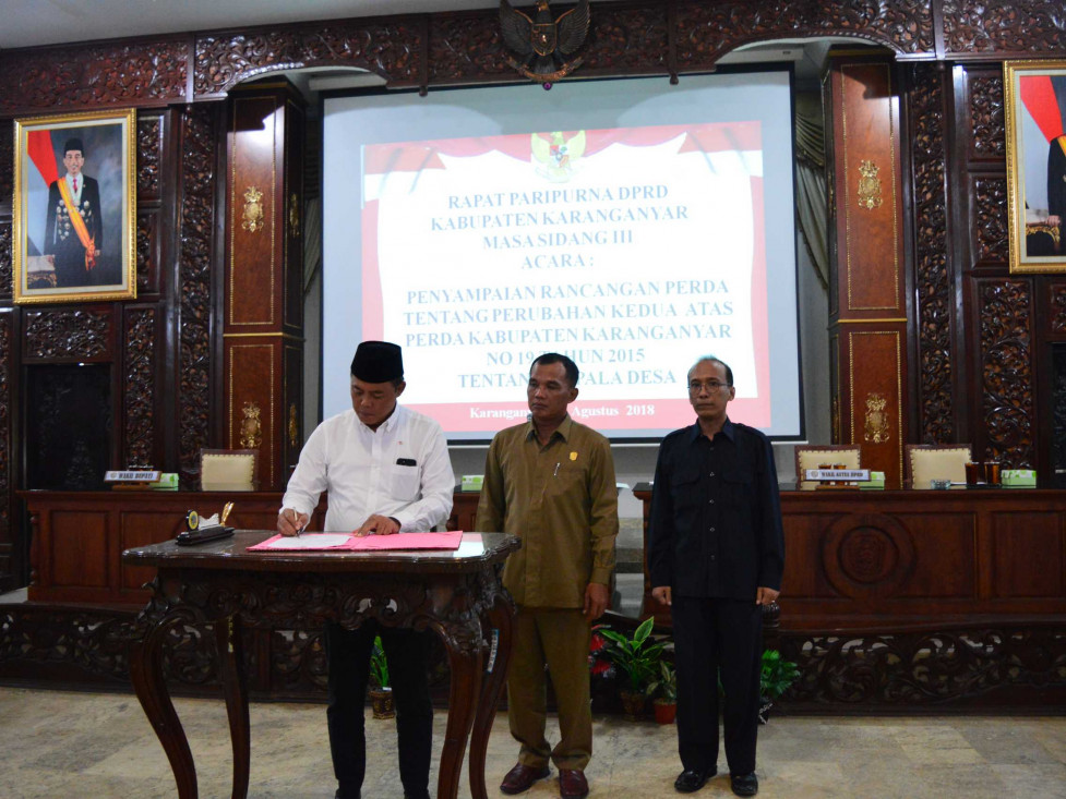 Rapat Paripurna DPRD Kabupaten Karanganyar masa sidang III, Jum’at (24/8) pagi dengan acara : Penyampaian Rancangan Peraturan Daerah (Perda) tentang Perubahan kedua atas Peraturan Daerah (Perda) Kabupaten Karanganyar No. 19 Tahun 2015 Tentang Kepala Desa.