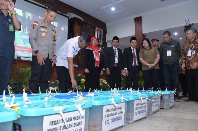 KARANGANYAR – Pemilihan Umum (Pemilu) 2024 memasuki tahap rapat pleno terbuka perolehan suara dan penetapan hasil tingkat Komisi Pemilihan Umum (KPU) Kabupaten Pj. Bupati Karanganyar bersama Forkopimda menghadiri dan memastikan perhitungan berjalan lancer dan tidak terdapat masalah. Kegiatan yang dilaksanakan di Kantor DPRD Kabupaten ini diikuti oleh Panitia Pemilihan Kecamatan (PPK) se Kabupaten, Bawaslu Kabupaten, dan saksi dari masing-masing paslon.