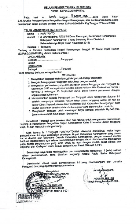 RELAAS PEMBERITAHUAN ISI PUTUSAN Nomor : 82/Pdt.G/2019/PN.Krg.