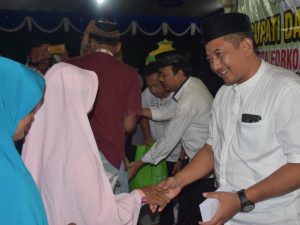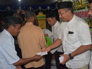 Wakil Bupati Karanganyar H. rober Cristanto saat memberikan bantuan sarana ibadah kepada Ta’mir Masjid Al Mukmin setelah sholat taraweh dalam rangkaian acara safari Ramadhan Taraweh Keliling Pemkab Karanganayar di Desa Jatisobo Kec. Jatipuro, Kamis (09/05).